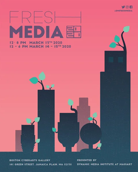 The Boston Cyberarts Gallery is pleased to present Fresh Media 2020, the annual Dynamic Media Institute's student art exhibit. The Dynamic Media Institute (DMI,) at Massachusetts College of Art and Design, is a master's program composed of a diverse group of educators, developers, designers, and artists. The work created by DMI students explores the